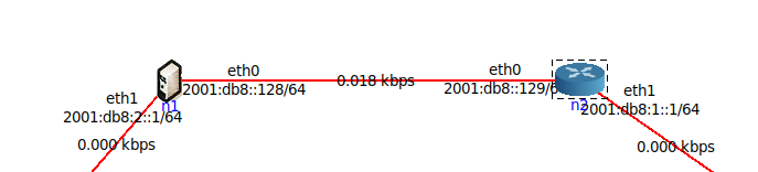 El problema particular que estoy teniendo es que cuando intento hacer un ping desde n1 a la red 2001:db8:1::/64 no tengo alcance. Adjunto las capturas de un ping desde n1 a la interfaz eth1 de n2. Para la cual se puede ver que n1 intenta hacer un neighbour discovery, n2 lo recibe a través de eth0 pero no le responde a n1. Adjunto también las tablas de rutas de ambos routers.